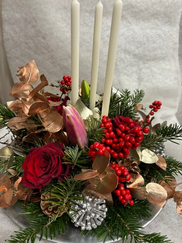 Round festive table arrangement on metal plate